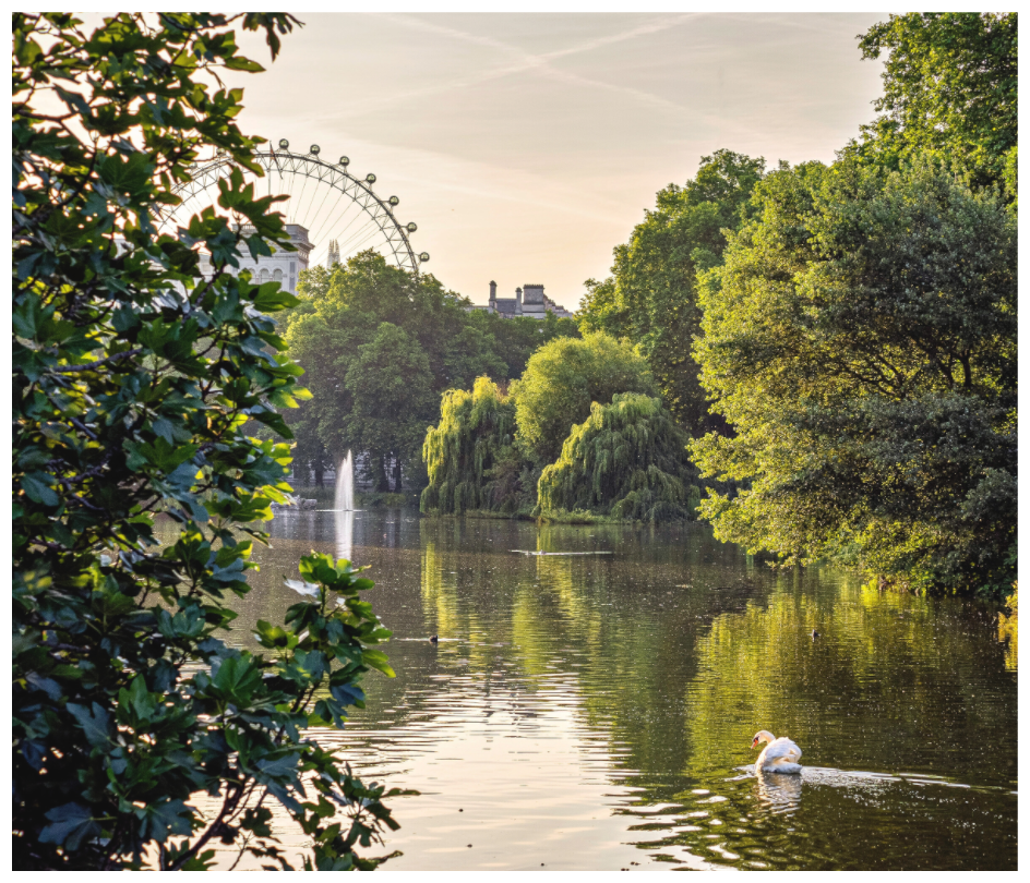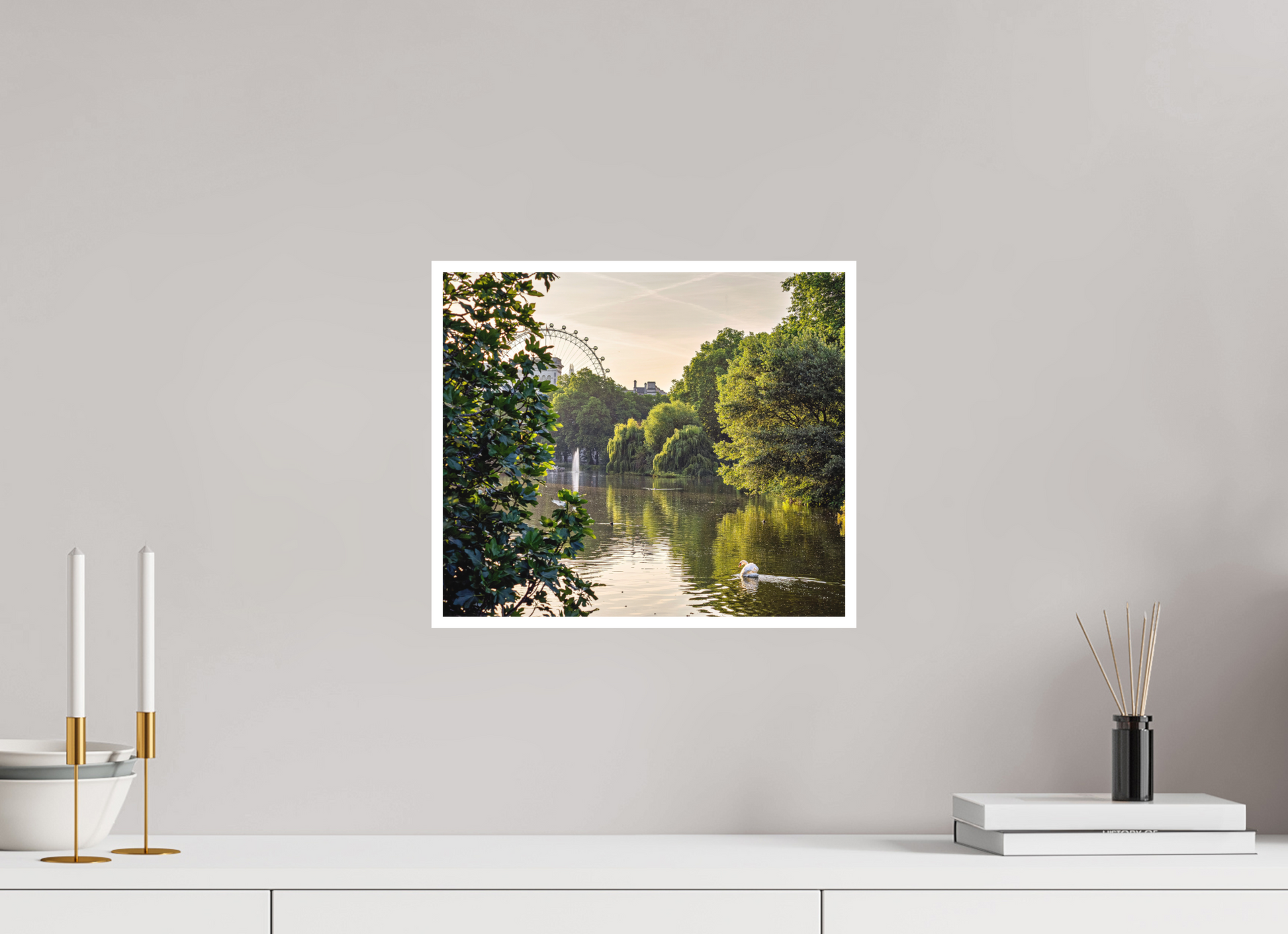A serene summer evening unfolds in the heart of London, where the calm waters of St. James’s Park reflect a golden glow. A lone swan glides effortlessly across the mirrored surface, framed by lush greenery and the iconic silhouette of the London Eye in the distance. This photograph captures a rare balance between nature’s tranquility and the city’s quiet elegance, inviting the viewer into a moment of peaceful stillness. Perfect for lovers of wildlife, urban landscapes, and timeless London scenes. Checkout Whitewall.com for more info on print options.