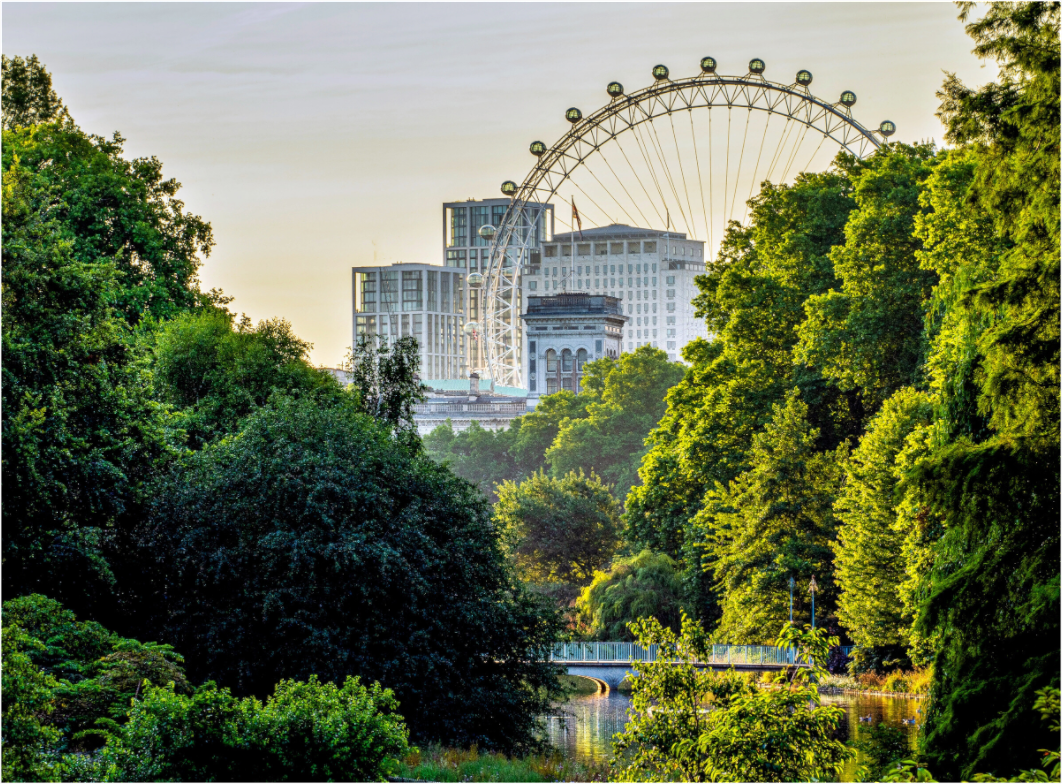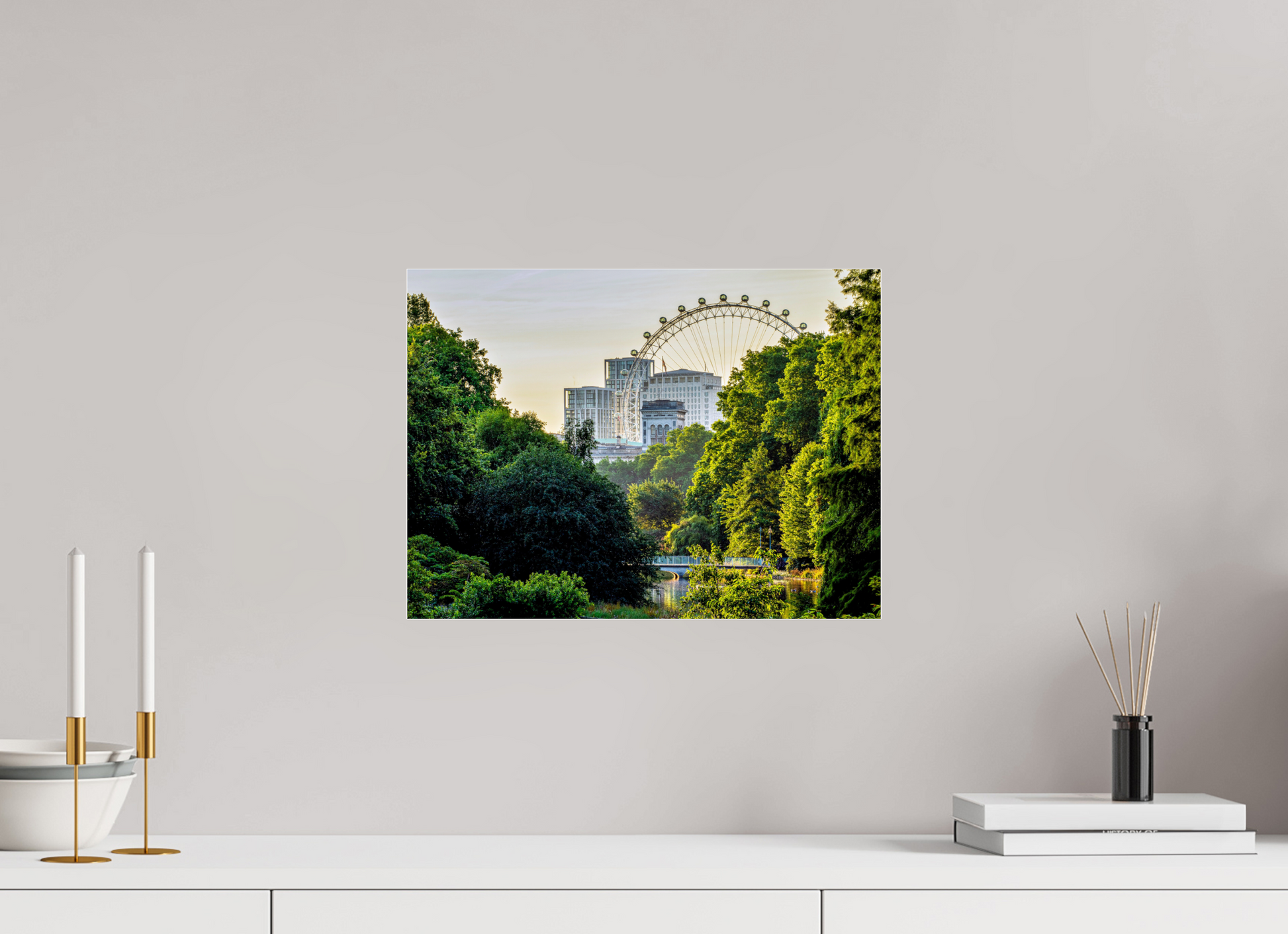 "Verdant Eye" captures a rare moment of harmony between London's iconic skyline and its serene parkland. Framed by a curtain of deep summer green, the London Eye emerges in the distance — a modern marvel softened by nature’s quiet embrace. The golden light of early morning weaves warmth into this peaceful city scene, inviting the viewer to pause and breathe in the calm beneath the urban canopy. Ideal for lovers of travel, urban nature, or anyone who finds beauty in the balance between architecture and greenery. This piece works beautifully in living rooms, offices, and reading spaces where you want serenity with a touch of grandeur.